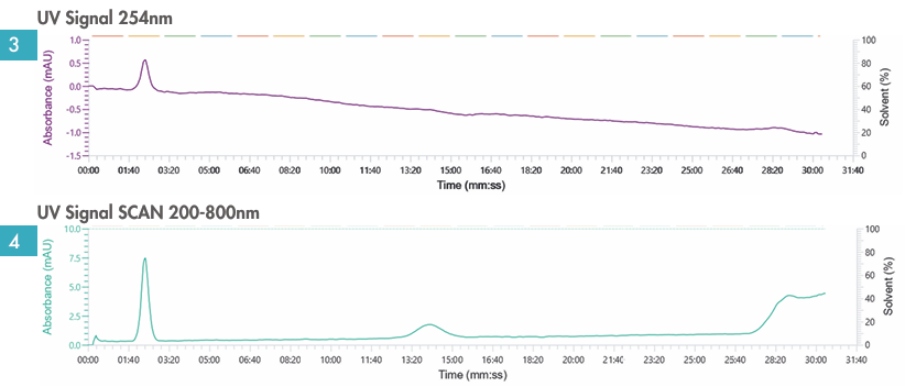 图3与图4:紫外检测下化合物不可见。 。。。 。检测初期首波化合物最先展现低强度信号,,,,,,但强度缺乏以实现有用网络